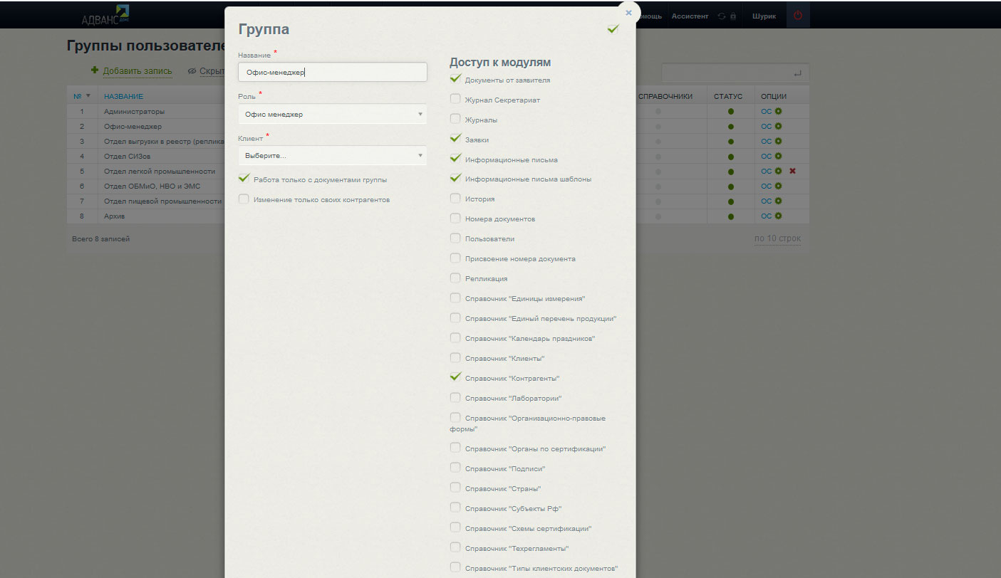 - Возможность создавать в одной системе неограниченное количество органов по сертификации с индивидуальными настройками доступа для пользователей