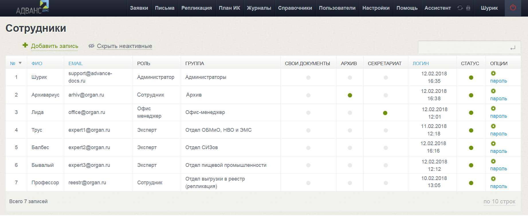 АДВАНСдокс сохраняет историю действия пользователей до минуты. Удобное формирование отчетности с применением фильтров: сколько комплектов документов было выдано за период, производительность сотрудников, статистика по заявителям