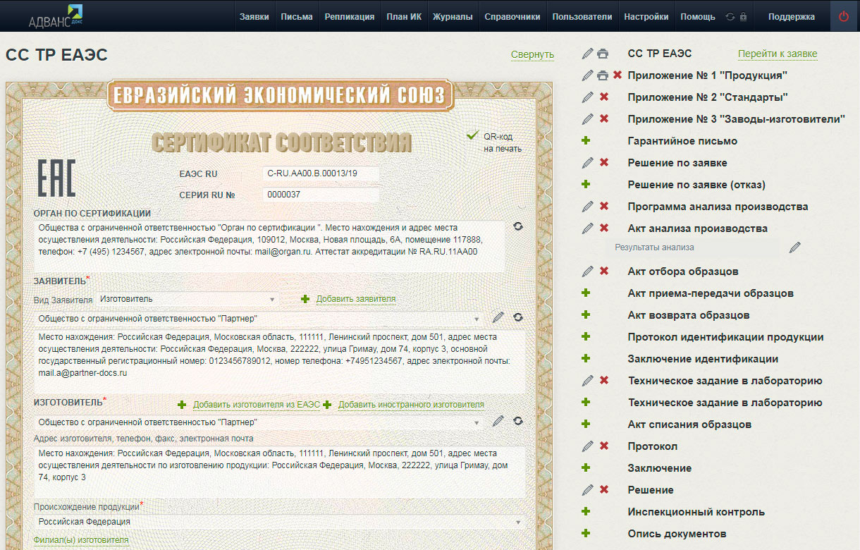 - Наша техническая поддержка помогает вам настроить систему для вашего органа по сертификации (нумерация, реквизиты и т.д.) и может сопроводить вас при выдаче первого документа