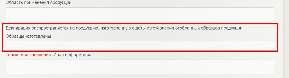 Обратите внимание, что указывать в поле текст «Декларация распространяется на продукцию, изготовленную с даты изготовления отобранных образцов продукции. Образцы изготовлены» не надо т.к. он автоматически добавится в печатную форму (поле «Дополнительные сведения») и в поле реестра (поле «Общие сведения об области применения продукции»).