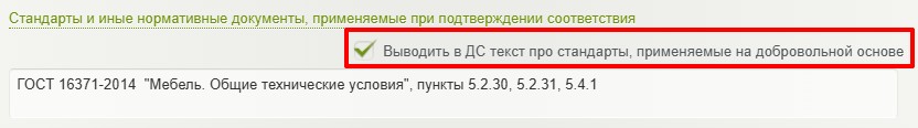 2. По многочисленным просьбам наших пользователей мы добавили в форму для заполнения ДС ТР ЕАЭС чекбокс, активизация которого позволяет в разделе «Дополнительная информация» печатной формы ДС и заявления на ДС перед информацией о стандартах выводить текст «Стандарт(ы), в результате применения которого(ых) на добровольной основе обеспечивается соблюдение требований технического(их) регламента(ов):».