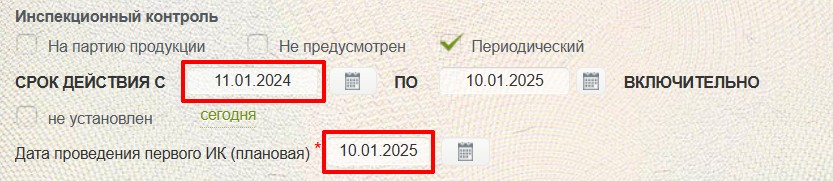 - В СС ТР ЕАЭС по многочисленными просьбам пользователей теперь дата проведения первого ИК будет рассчитываться ровно через один год от даты начала действия сертификата (раньше было 1 год + 1 день).
