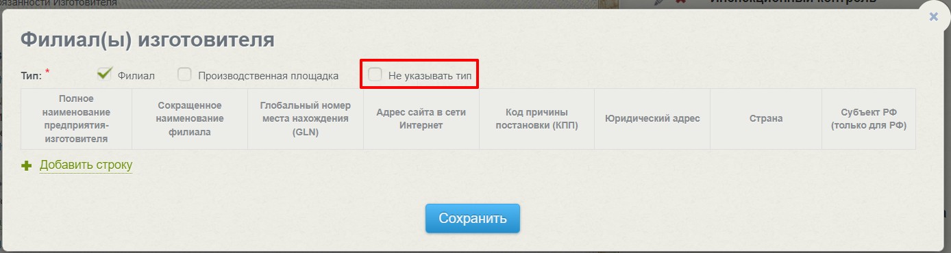 2. В СС ТР ЕАЭС в окне «Филиалы изготовителя» добавлен чек-бокс «Не указывать тип». При выборе этого чек-бокса в результирующее поле и печатную форму не будет выводиться тип (филиал или производственная площадка).