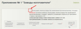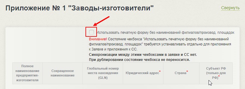 4. В форму для заполнения приложения «Заводы-изготовители» к заявке и СС добавили чекбокс «Использовать печатную форму без наименований филиалов\производ. площадок» (см. картинку ниже). По умолчанию чекбокс не выбран.